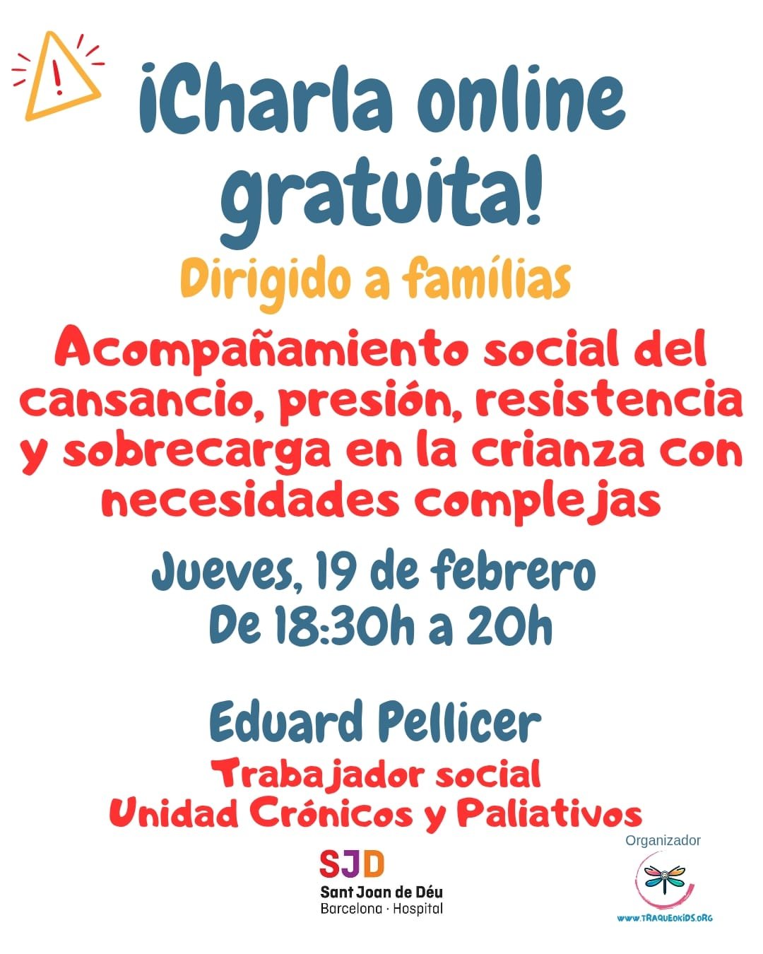 Inicialmente, Eduard Pellicer, trabajador social del la Unidad de Crónicos y Paliativos del Hospital Sant Joan de Déu de Barcelona, hará una presentación inicial y, posteriormente, se abrirá un espacio participativo donde las familias podrán expresar sus dudas, compartir inquietudes, vivencias, y generar un intercambio vivo y enriquecedor, acompañado y guiado desde la mirada profesional y cercana de Eduard, facilitando la reflexión, el diálogo y la escucha mútua.